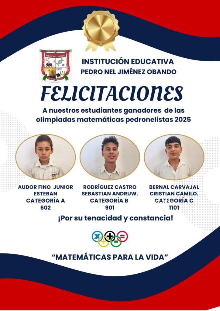 Felicitamos con orgullo a los estudiantes de la Institución Educativa Pedro Nel Jiménez Obando, quienes se destacaron como ganadores en las Olimpiadas Matemáticas 2025, demostrando un excepcional dominio del razonamiento lógico, la resolución de problemas y la creatividad numérica. Su dedicación, perseverancia y pasión por las matemáticas no solo reflejan su talento individual, sino también